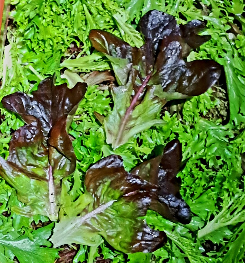 Before I started farming, all the lettuces I knew were iceberg, red leaf and romaine. Now I am amazed how many varieties exist and how different and beautiful each of them is! The photos show red oakleaf lettuce. We planted them because one of our customers said these are his favourite. They are tender and mild and beauty in the eye. Nice addition to our salad mix.