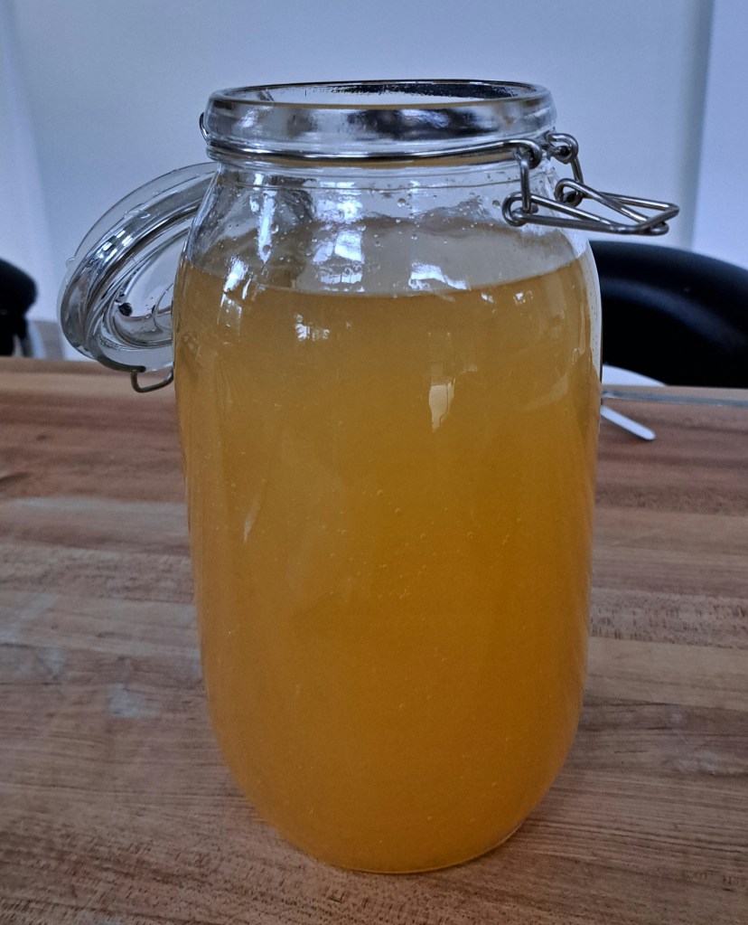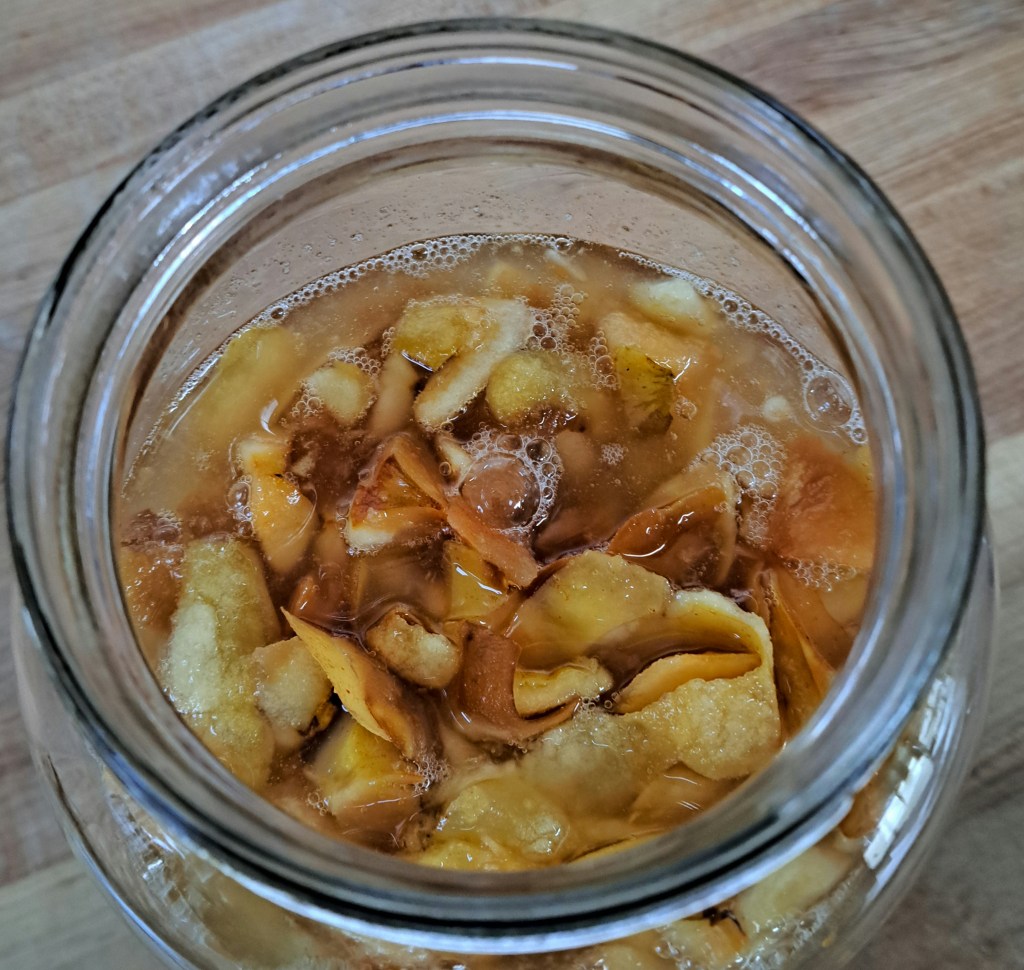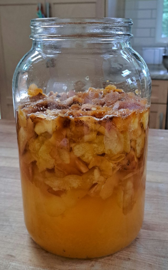 One week after we started making apple vinegar (link here), the liquid became darker and started to taste like alcohol! The surface is really bubbly. Definitely something is going on. We strained and moved the bottle to our pantry where it is cool and dark. 3 to 4 more weeks and it is supposed to become vinegar. So exciting. Stay tuned!