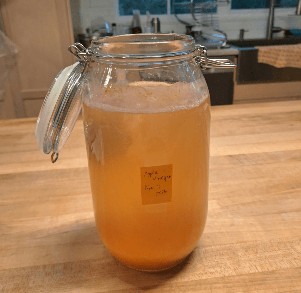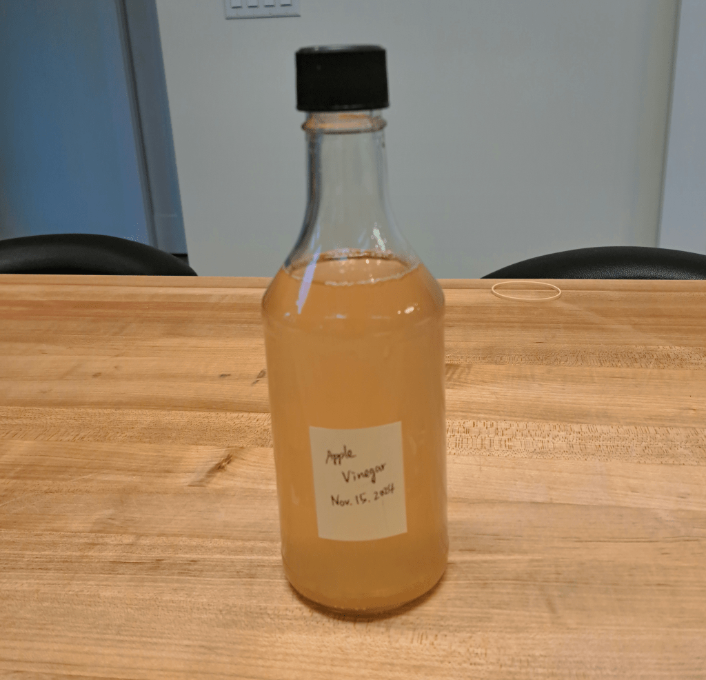 Apple scrap vinegar started on Nov. 15 is now complete! (click here to see our original post). Taste milder than store bought apple cider vinegar and with pleasant fruit flavour. We are very happy with the result of our first-time experiment and surprised how easy it was.