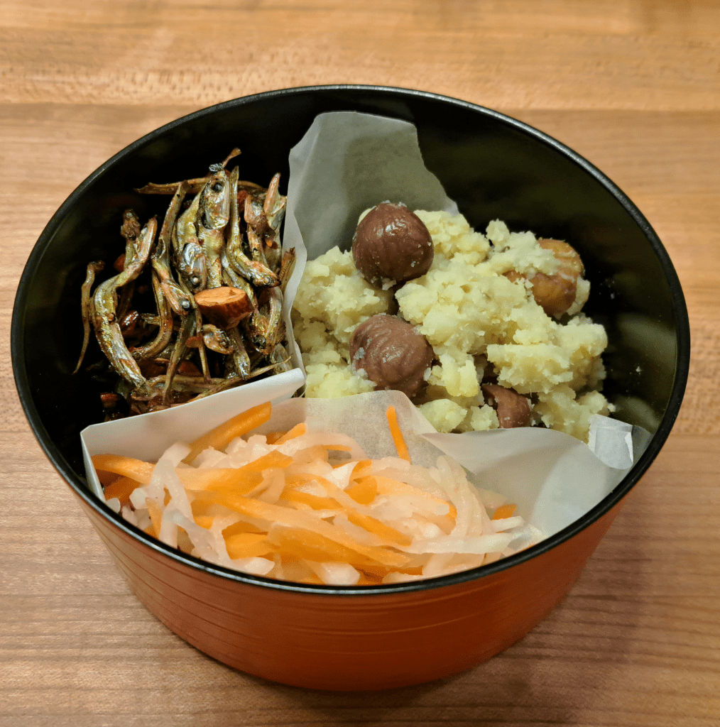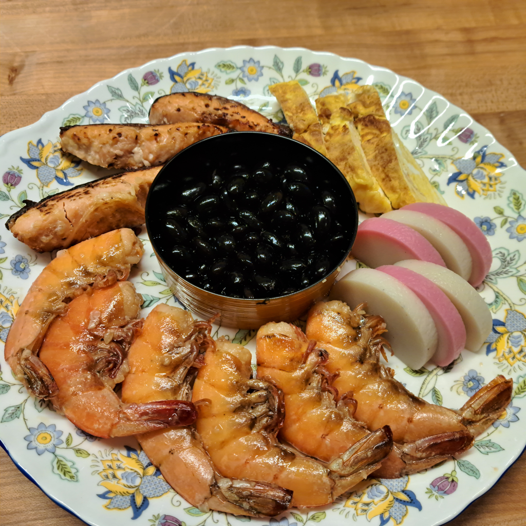 New years day is the biggest holiday in Japan. We asked our son to bring ingredients from Vancouver (as there is no asian grocery store in Gabriola…) and made some new year’s dishes. Each dish has a meaning. Shrimp is for longevity from the shape that the back is bent like old people, black beans are for hard work from Japanese pronunciation of beans “Mame”, and mashed sweet potatoes are for prosperity from the gold (yellow) color!