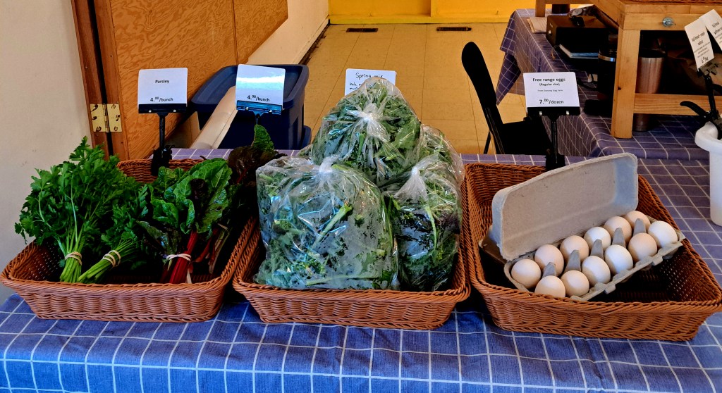 Last week, thanks to the sunshine we had, our over-winter kale, chard and parsley grew a lot and we were able to bring some to the market. This week seems to have a lot of rain, which will help the new crops to grow. Let’s see what we can bring this Saturday.