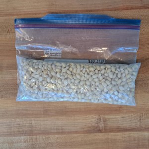 - Make small holes (1 hole in every 3cm) in a large size ziplock bag and put the beans in it. Shape it a tight rectangle.