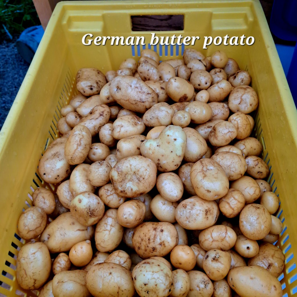 Potatoes are here! Our potatoes are German butter potatoes, which has dense, nutty, buttery flavor. They are good for baking, roasting, mashing, frying, almost anything. They go well with butter or oil, with herbs such as rosemary, parsley, dill, thyme, oregano… are you hungry now?