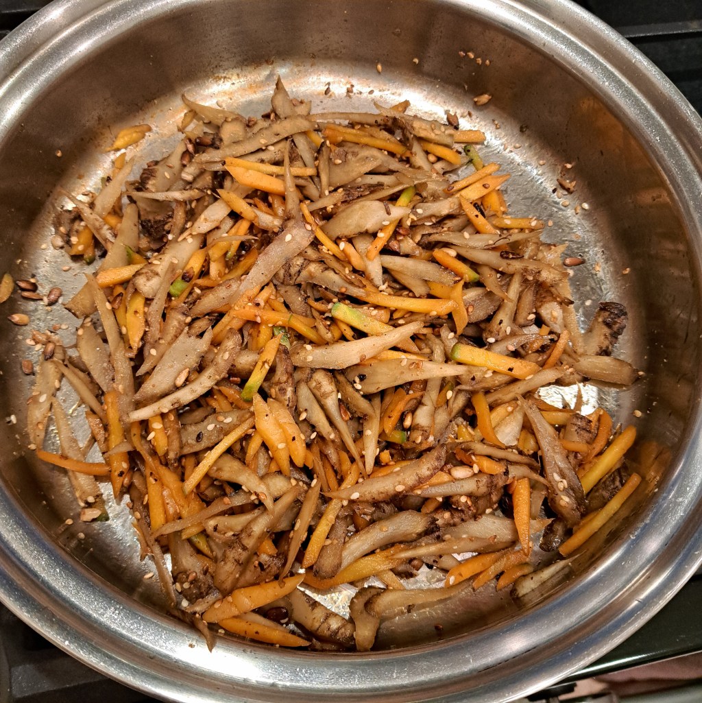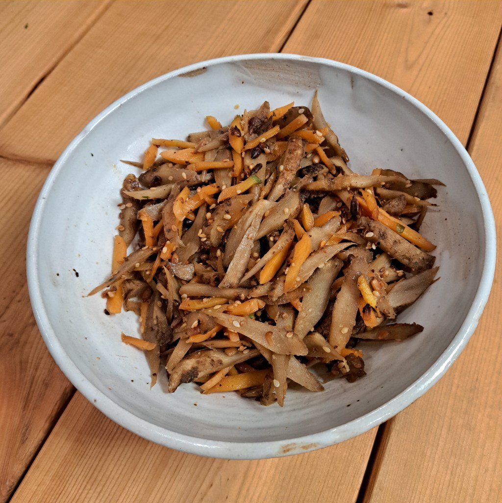We made kimpira gobo and it was enough for two of us. We will post a recipe when we have gobo next season but basic procedure is to stir fry gobo and carrots in sesame oil until soft, add sugar, mirin or sake and soy sauce, and shimmer until most of the liquid evaporate.