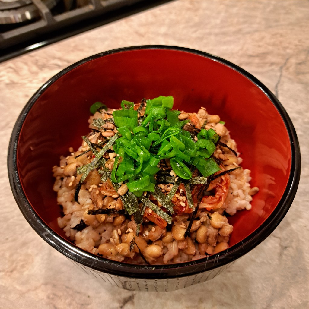 Garnish with roasted sesame seeds, sunflower seeds and green onions. Season with soy sauce. Enjoy!