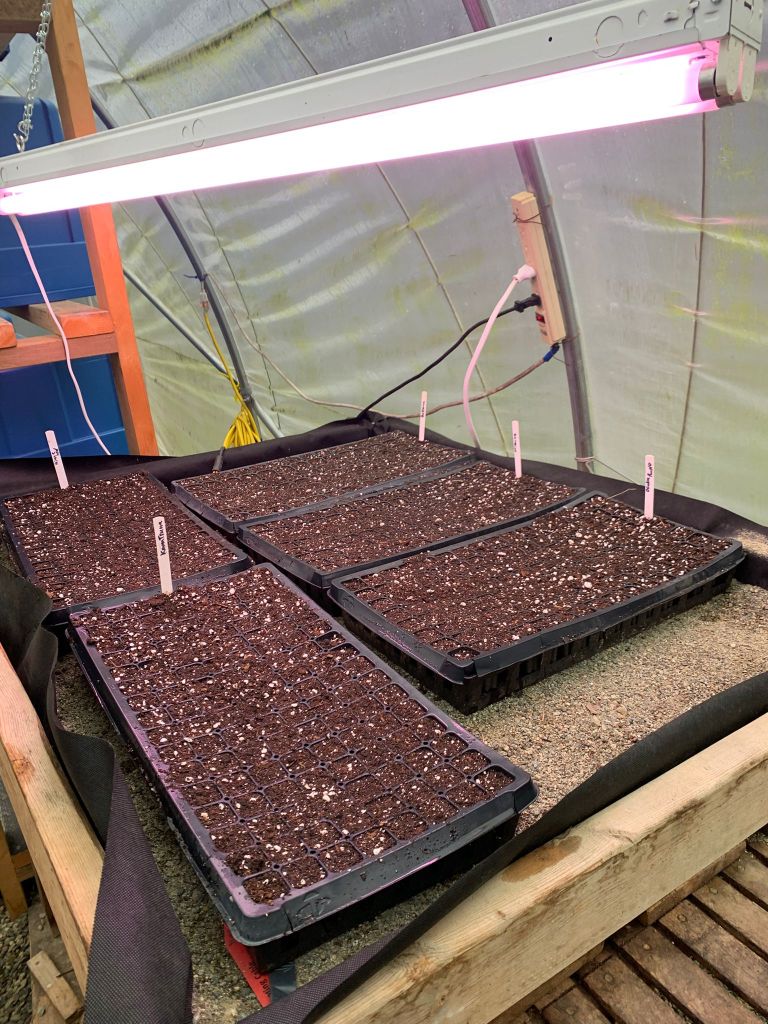 Inside of greenhouse, we started mustard seed trays. Next morning, we went back to the greenhouse and found that some of the seeds were dug up by a mouse… but just a few pods in each tray. Probably mustard seeds were not most favorite food for mice… lucky for us. Outside, we got a bed for peas ready. We will sow peas after the cold wave this week.