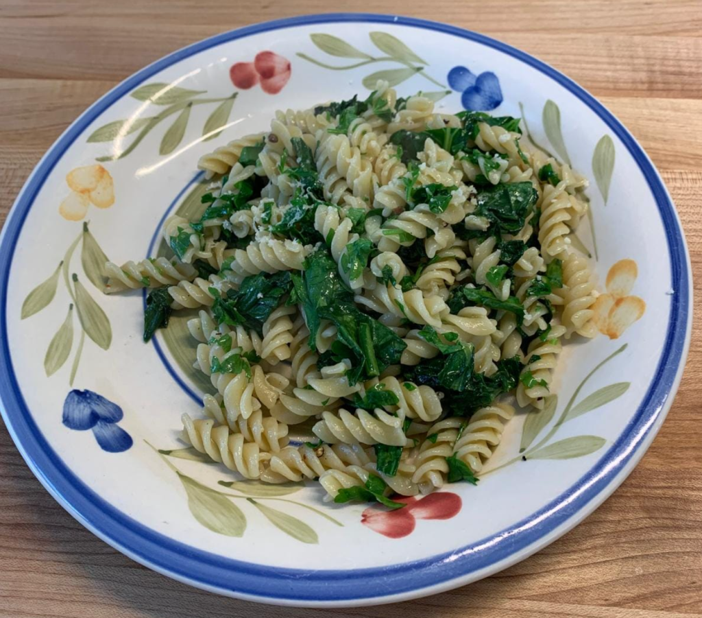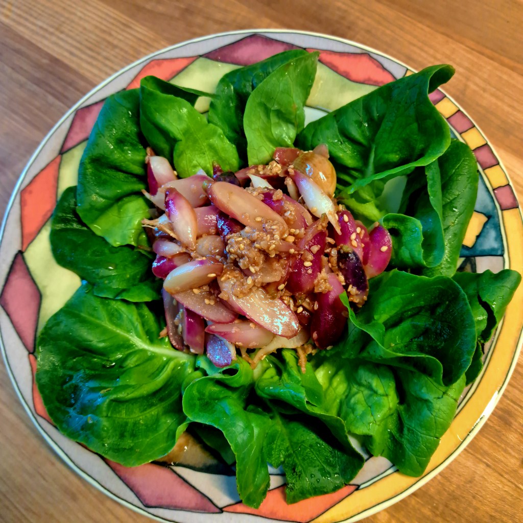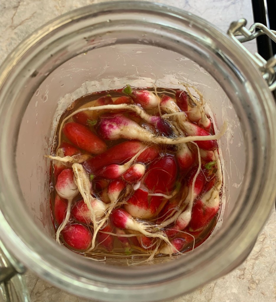 Ingredients: komatsuna, radish, olive oil, apple cider vinegar, maple syrup, salt, pepper