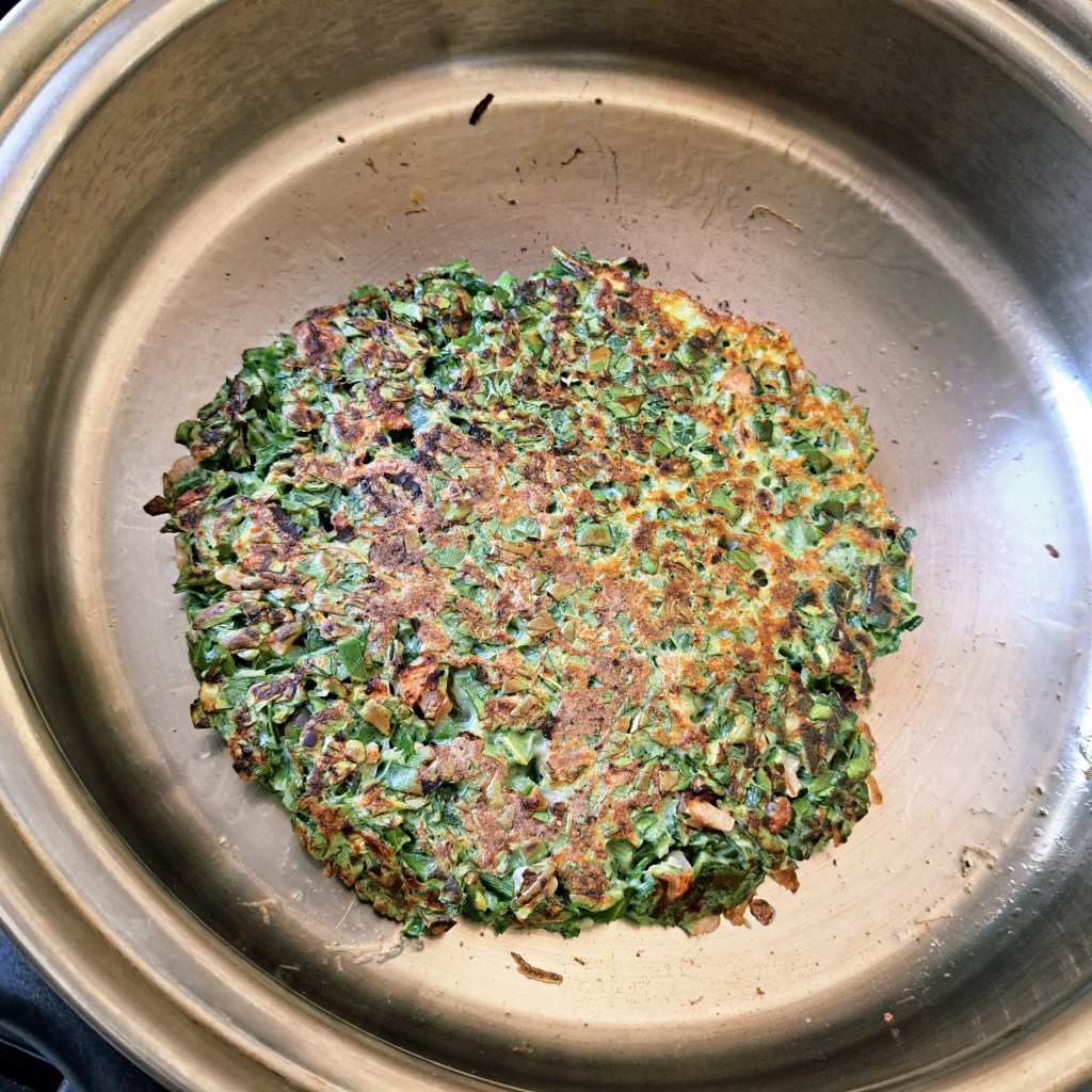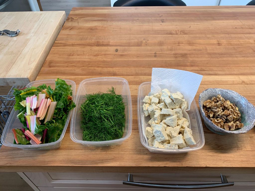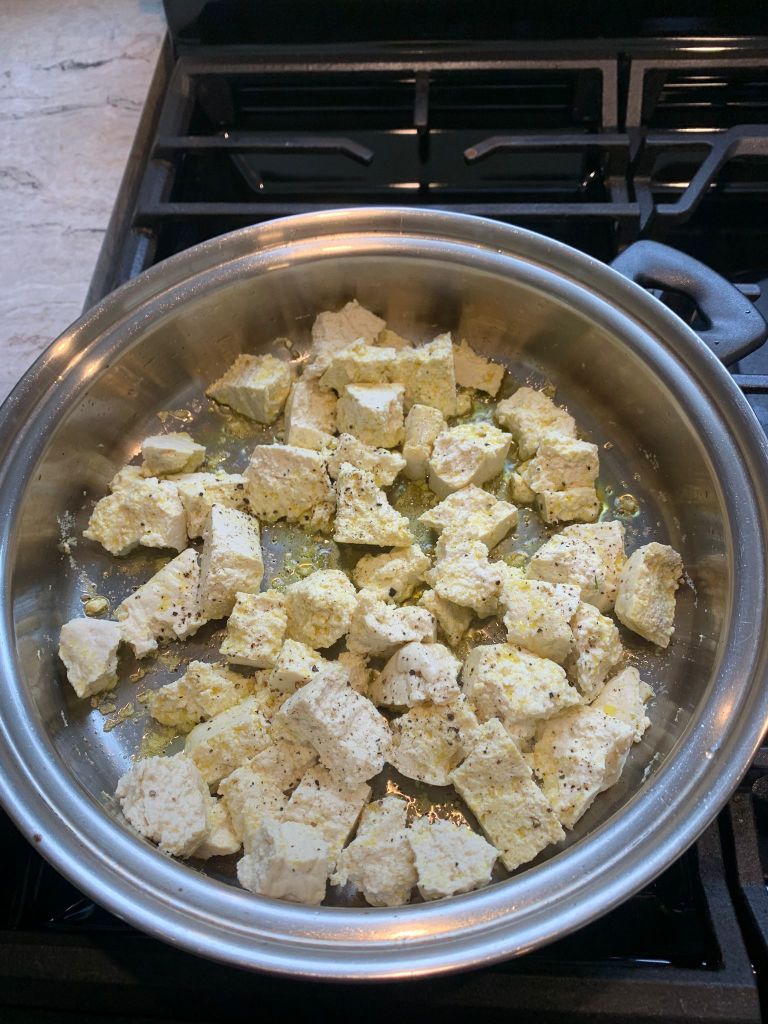 Chop chard and dill into bite size. Break tofu by hand to bite size chunks. Mix seasonings except salt and pepper. Set aside.