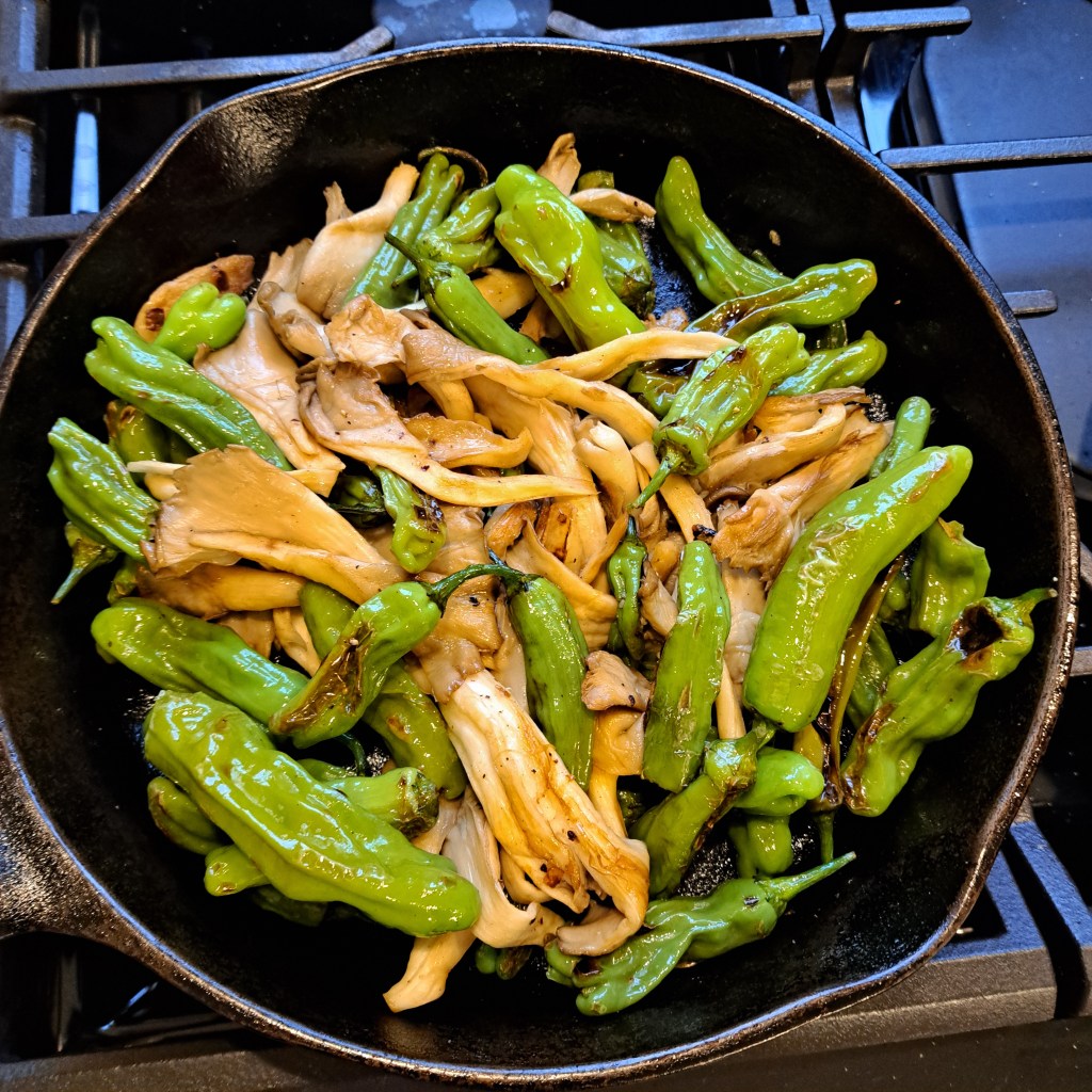 Ingredients: oyster mushrooms, shishito peppers, minced garlic, olive oil or butter