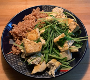 By hand break up tofu into 1/2 “ cube, pat dry with kitchen paper. Combine soy sauce and lime juice to make instant Ponzu, set aside. Heat up butter in a pan and sear tofu, season with salt and pepper. Add white stem of Mizuna, stir fry for about 1 min, season with salt. Add green Mizuna, stir fry about 1 min, season with salt. Move from a pan to a plate, pour “Ponzu” and sesame oil on top. Serve with steamed brown or regular rice