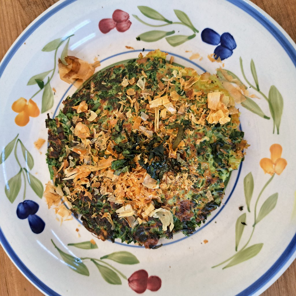 “Okonomi” means “as you like”. Above ingredients are just one example and you can put whatever you like to make your own Okonomiyaki. For sauce, you can buy “Okonomi sauce” at an Asian store, or use your favourite barbecue sauce. Or, make your own, like we did. We mixed tamari, maple syrup and Roasted garlic and onion hot sauce from Midnight Raven on Gabriola.