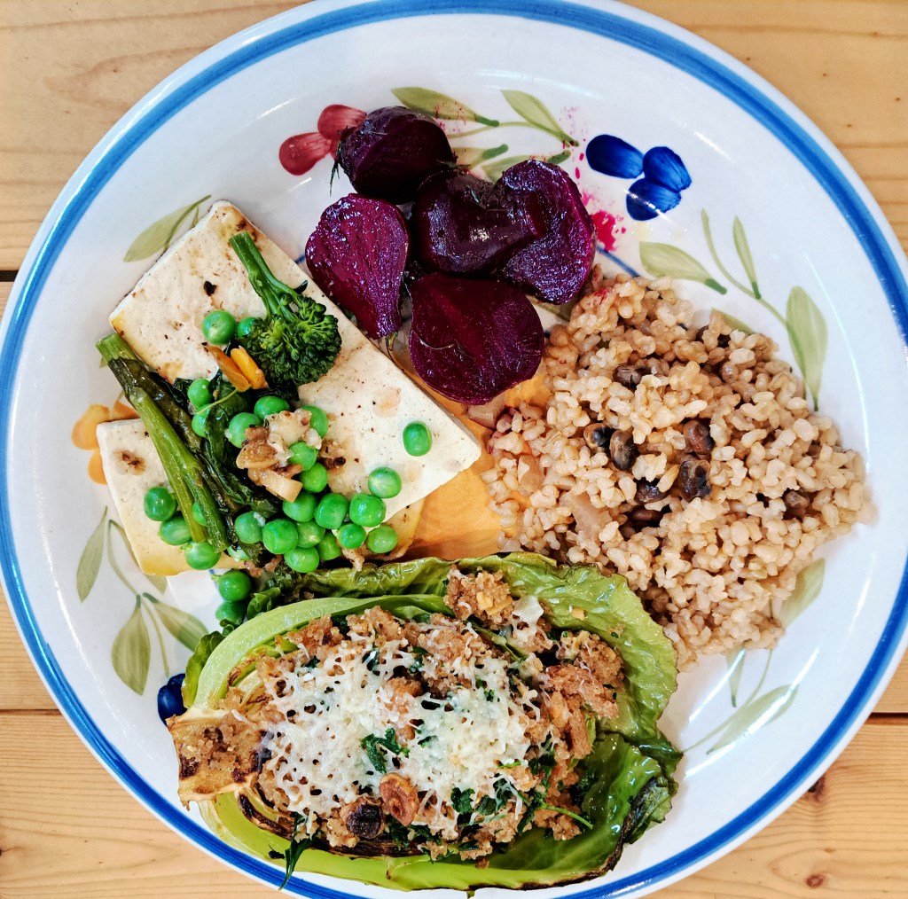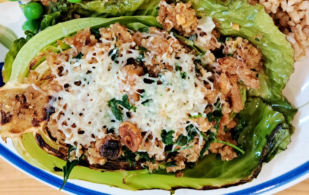 Method: In a small pan, melt butter. Mix in panko, parsley, and miso. Set aside. In a large frying pan, heat olive oil. Put cabbage halves in, cut side down. Cook for a few minutes or until the edge turned brown but not burnt. Turn them over. Sprinkle with salt and pepper and put panko mixture on top. Cook over low heat for 5-10 minutes with a lid on. (Alternatively, you can roast in a oven.) Garnish with parmesan cheese. Enjoy!