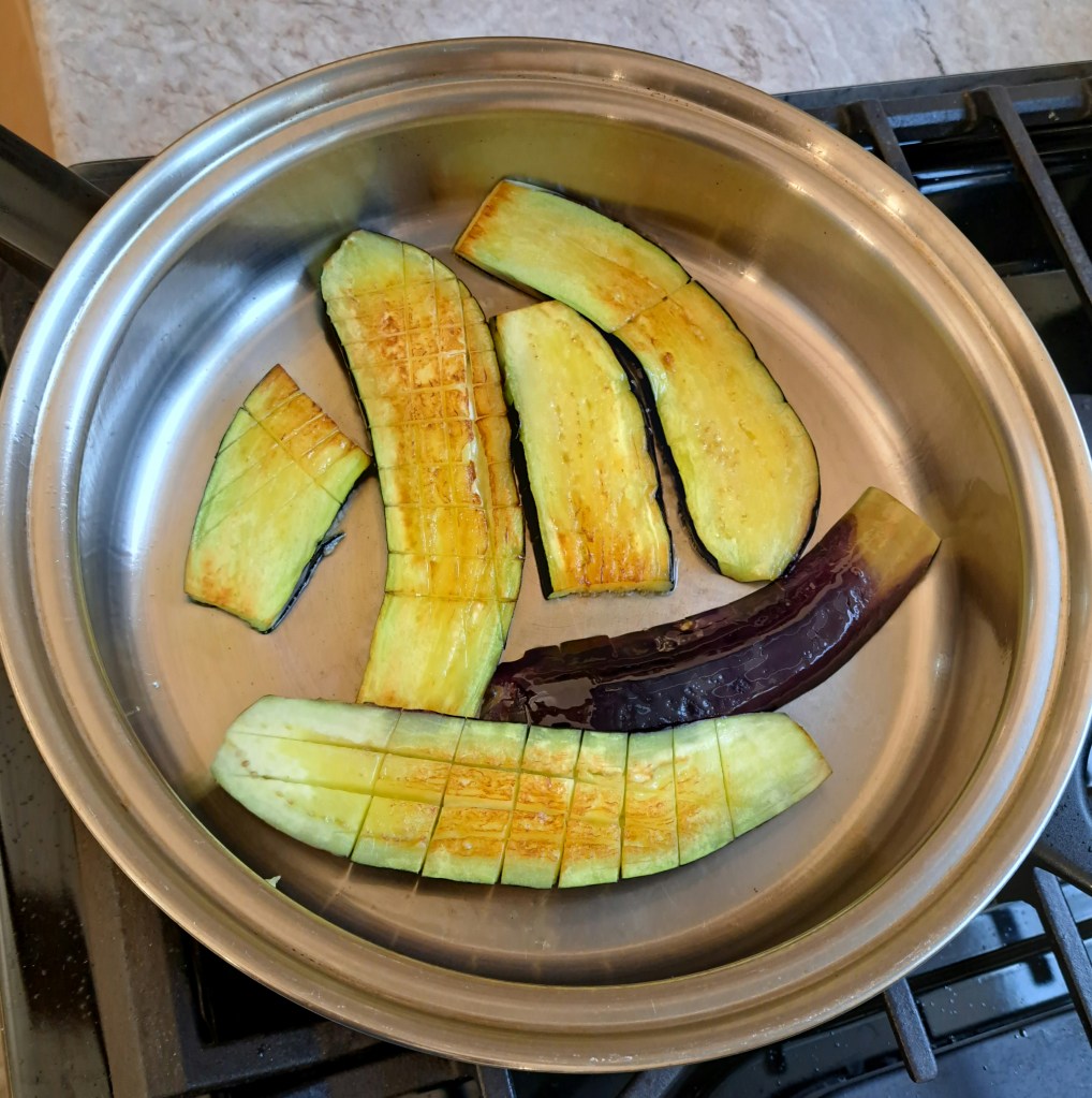 Slice the eggplant lengthwise into 1/4-inch-thick and add criss-cross slits on one side of each slice. Do not cut it through, just halfway of the slice. Transfer them to a bowl of salted water to prevent them from turning black.