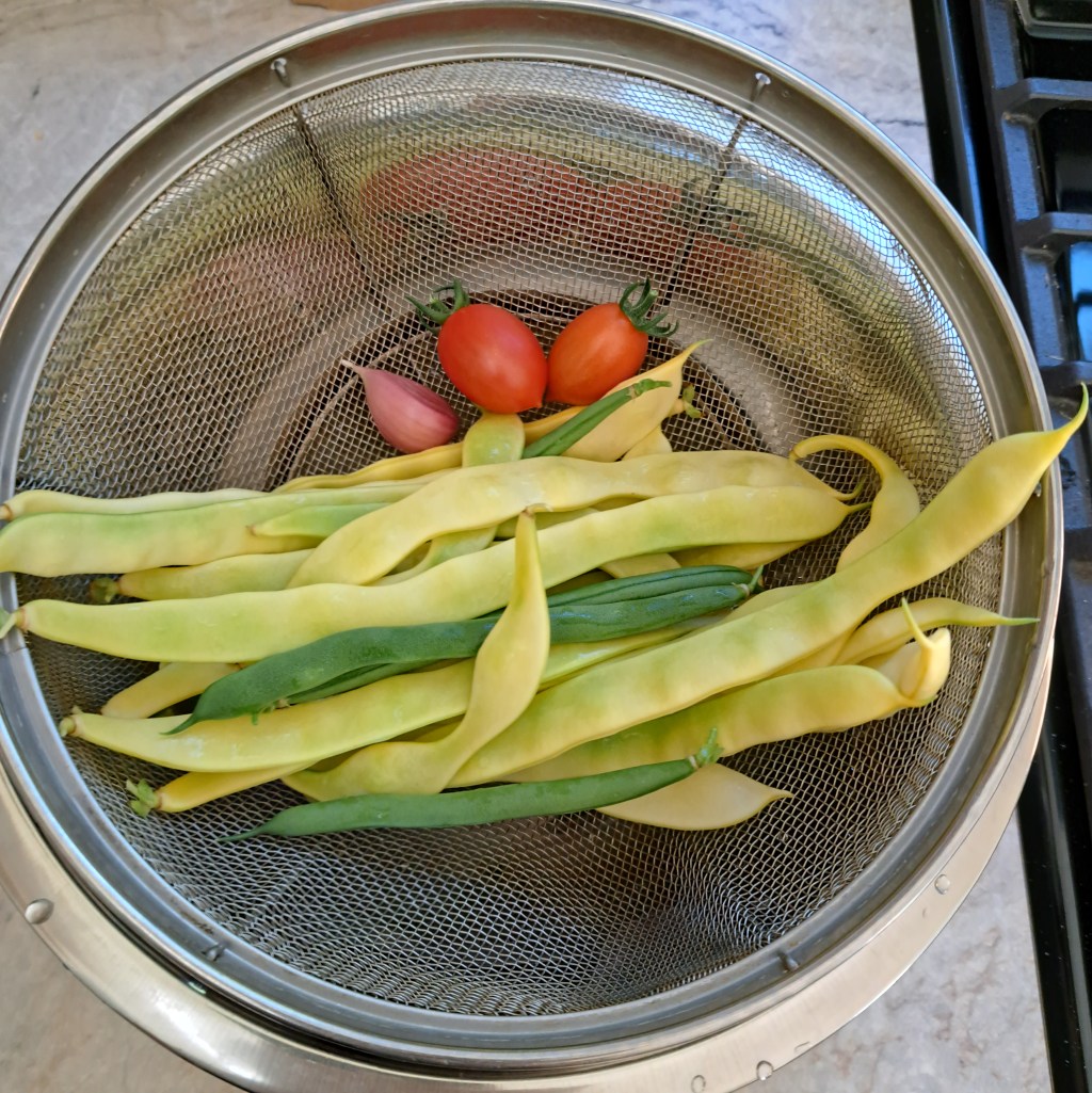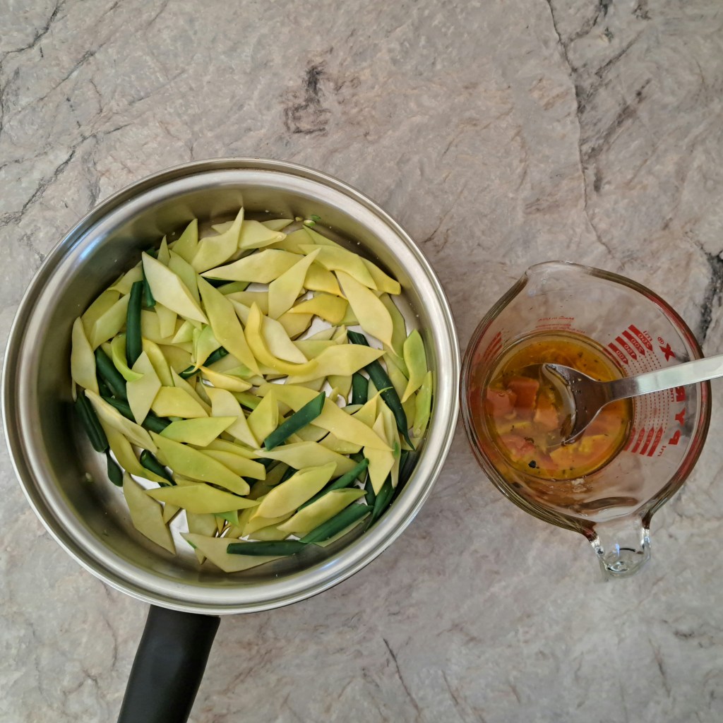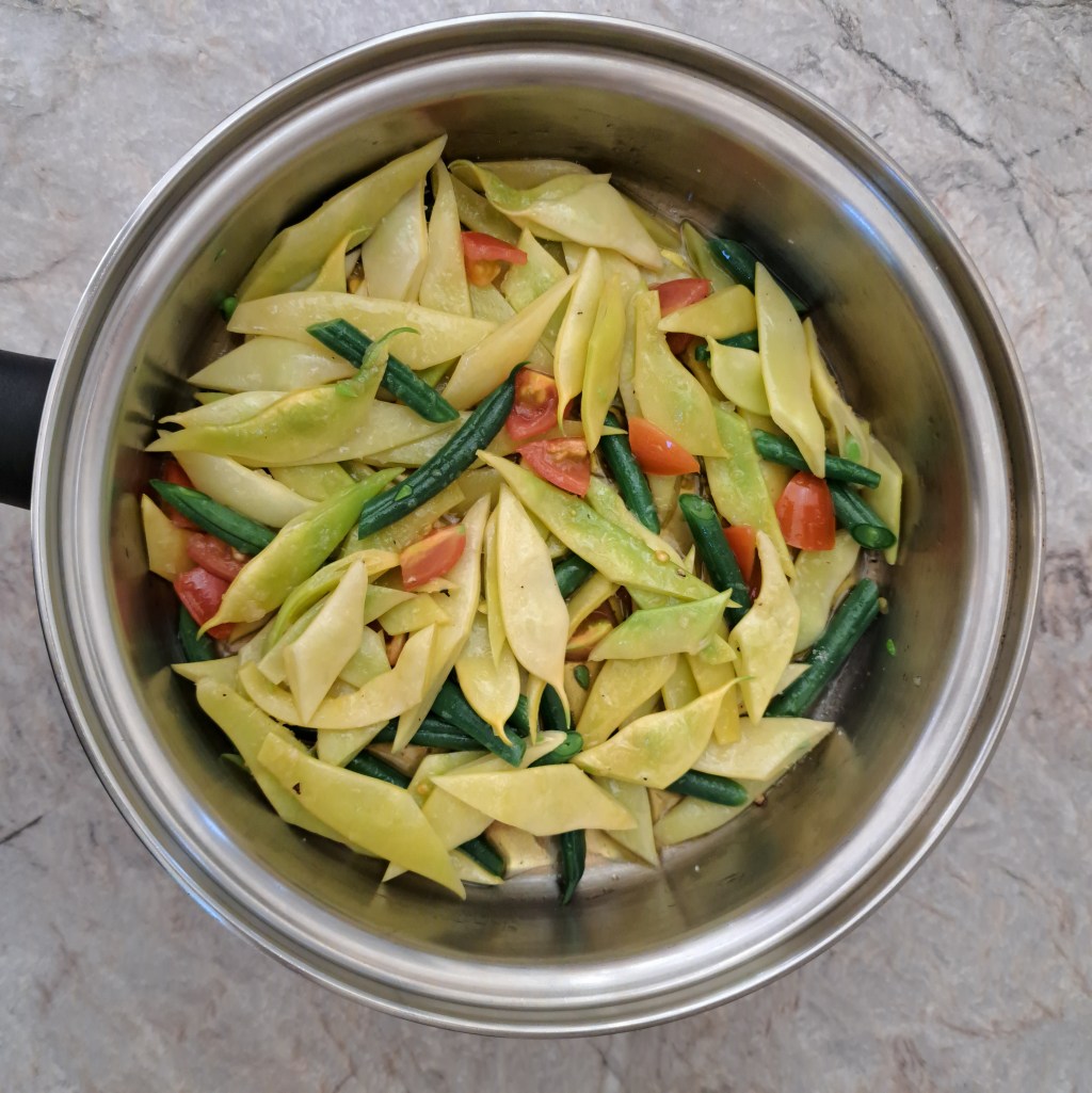 Wash and cut the beans into bite size. Steam lightly (do not overcook!). Set aside.