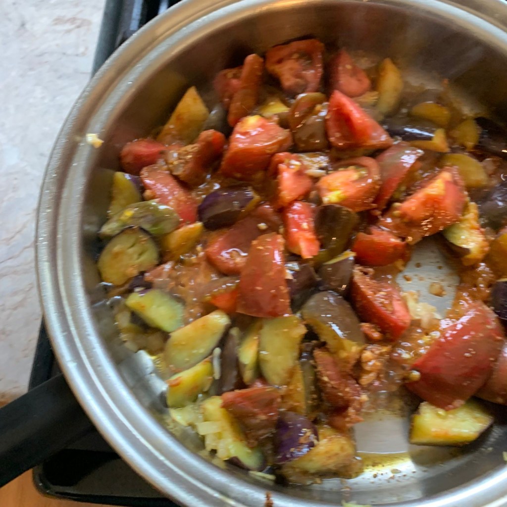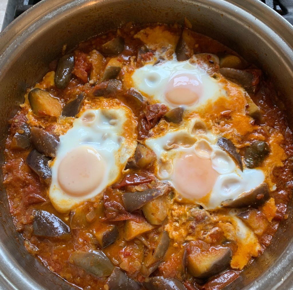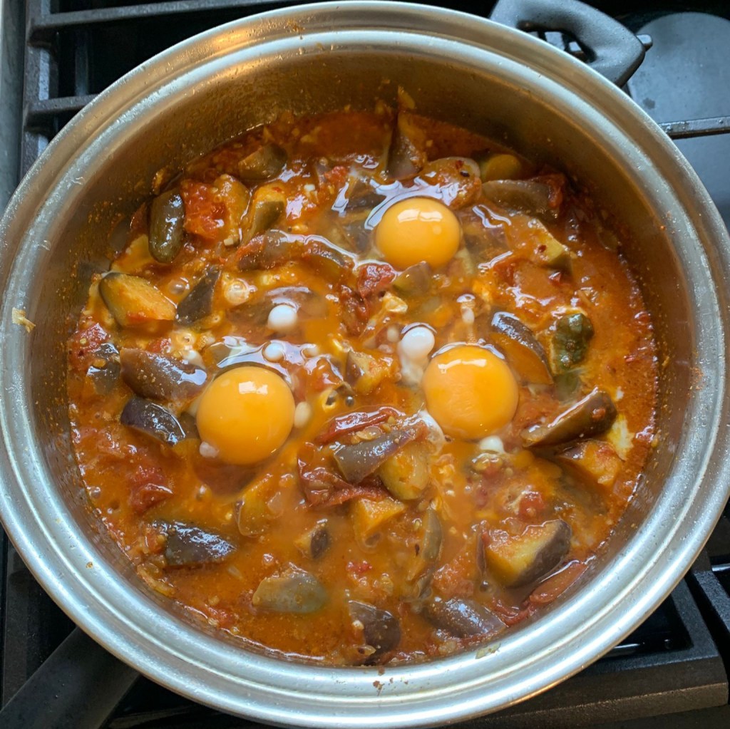 In a large skillet with a lid, heat generous amount of oil (canola or olive oil), medium high, cook garlic until fragrant, add onion and eggplant, season with salt, stir and cook until eggplant becomes soft. Add tomatoes and ground cumin/coriander/paprika mix, stir to mix all together, lower heat and simmer with a lid on, for about 10 min, or until eggplant becomes really soft. If the sauce becomes too thick, add a little bit of water. Make wells in the eggplant/tomato sauce and crack eggs into them, cook until eggs are half cooked. Season with salt and pepper to your taste. Enjoy with a slice of bread, rice or pasta!