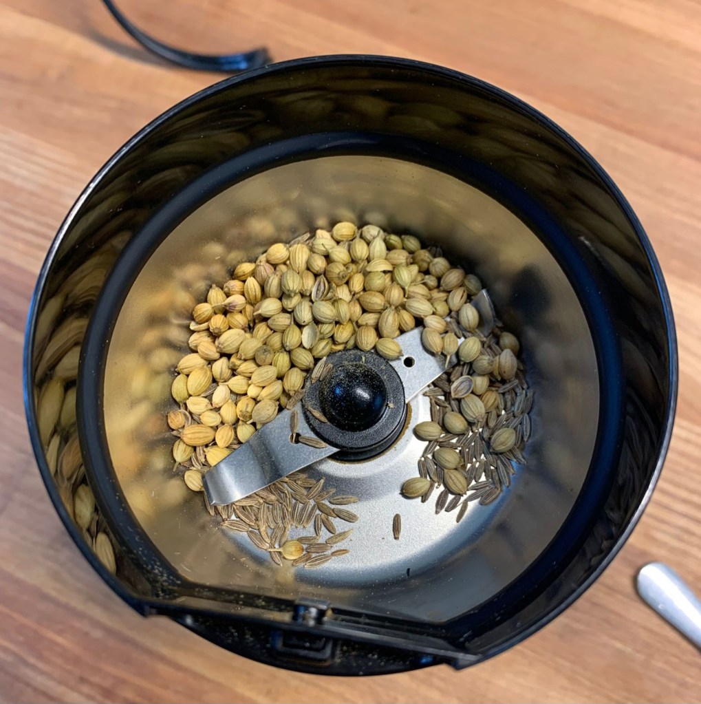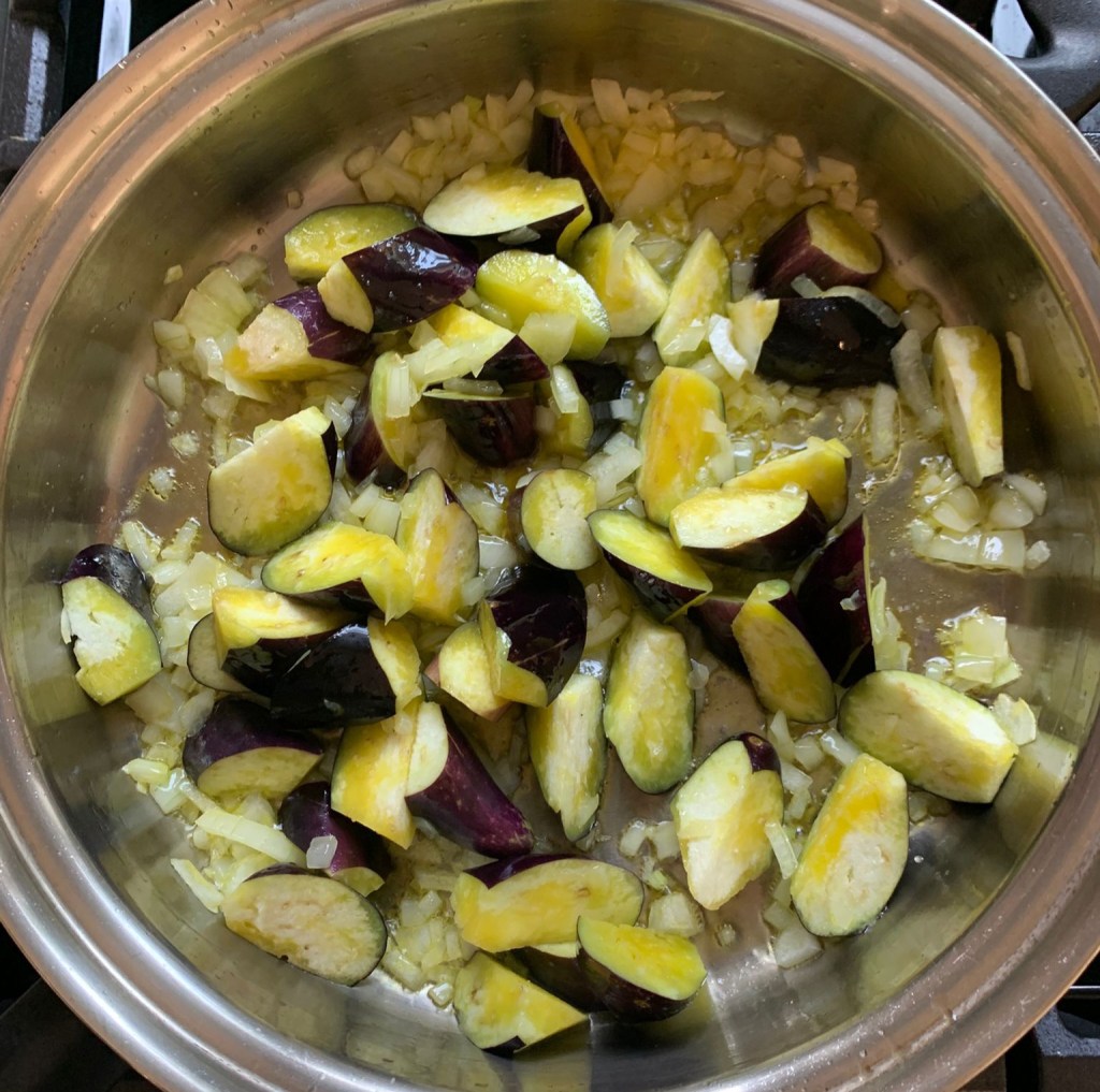 Remove stems from eggplants and cut into bite size. Cut tomatoes into bite size. Dice onion. Mince garlic. Set all aside. Using an electric grinder, grind cumin and coriander. Mix it with paprika