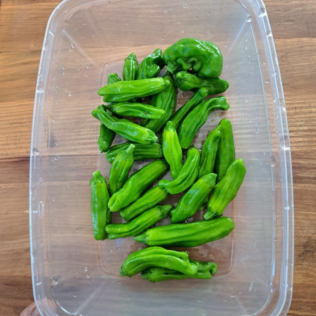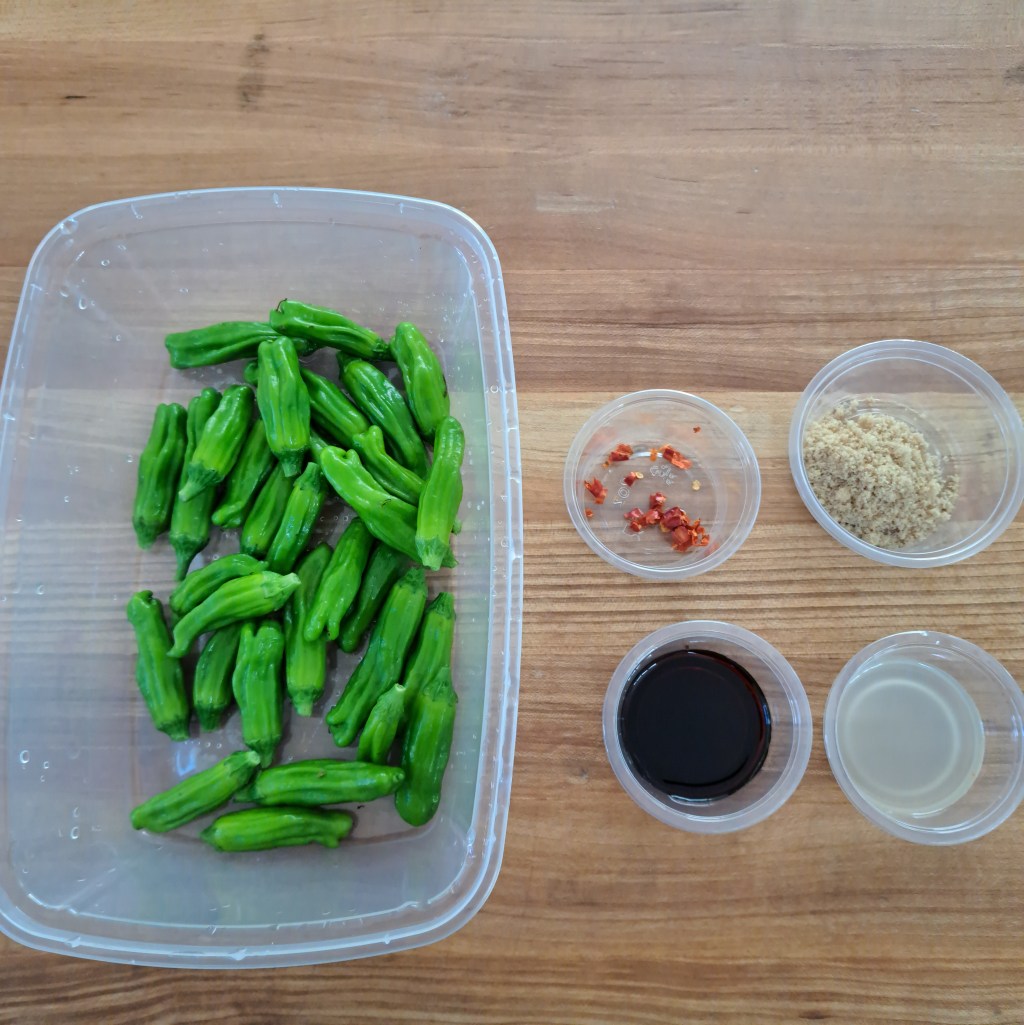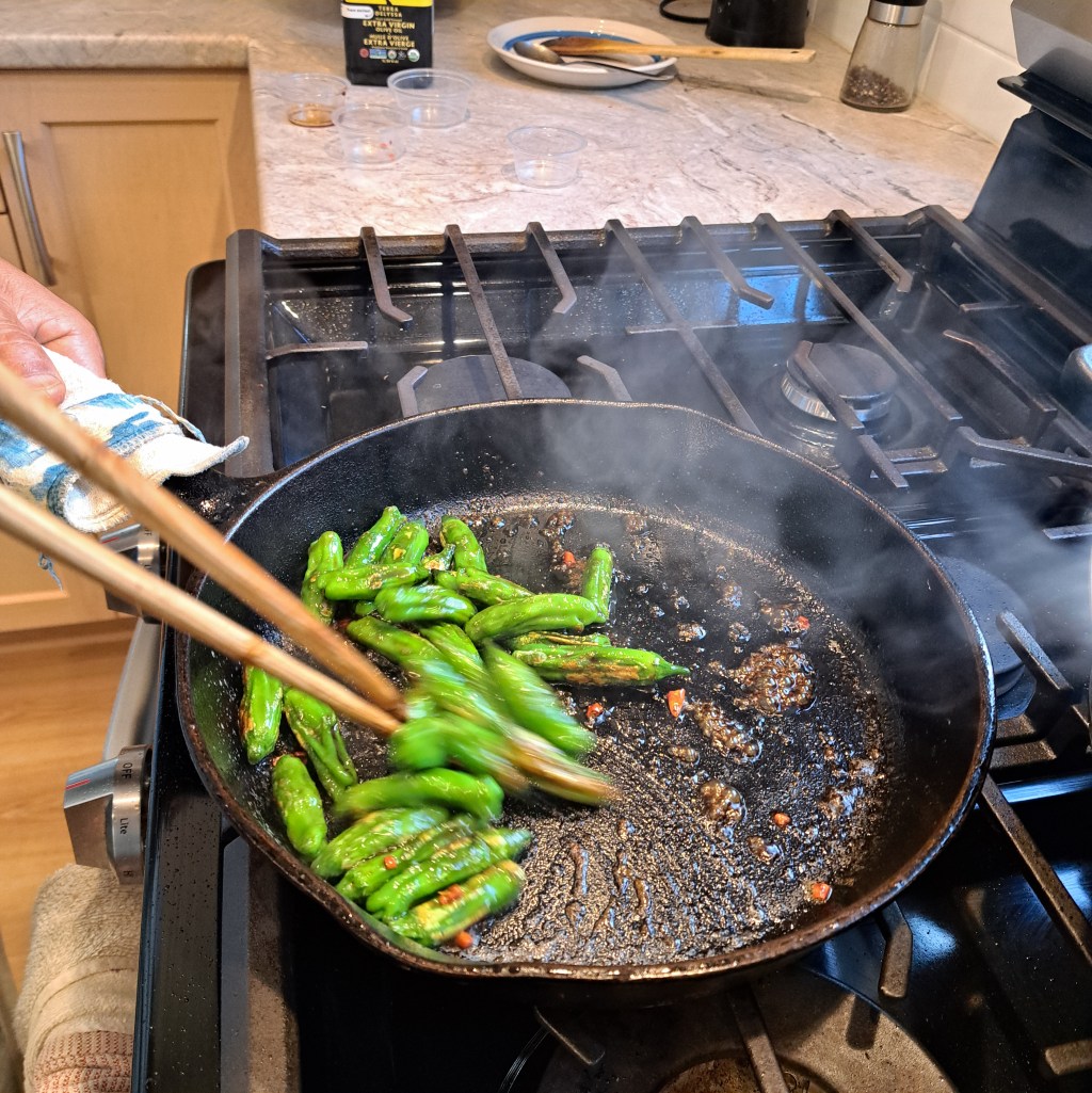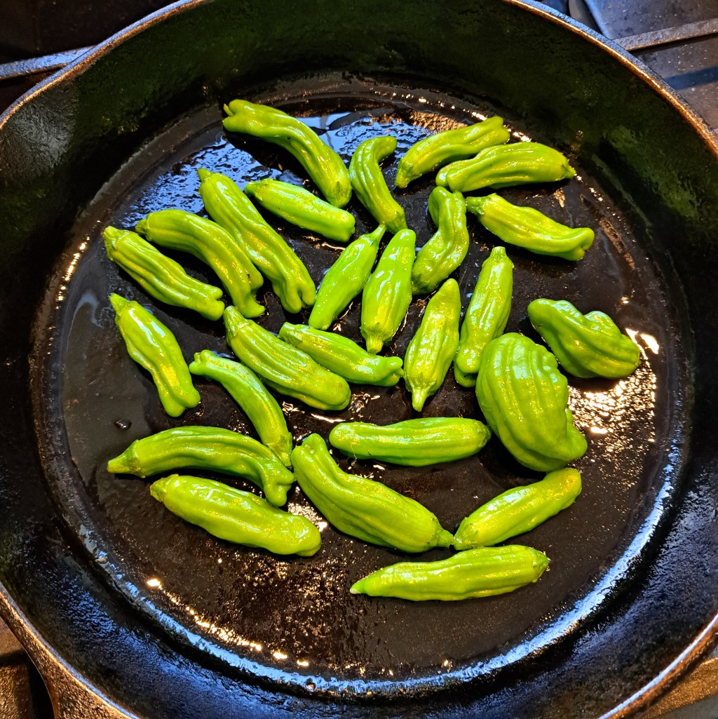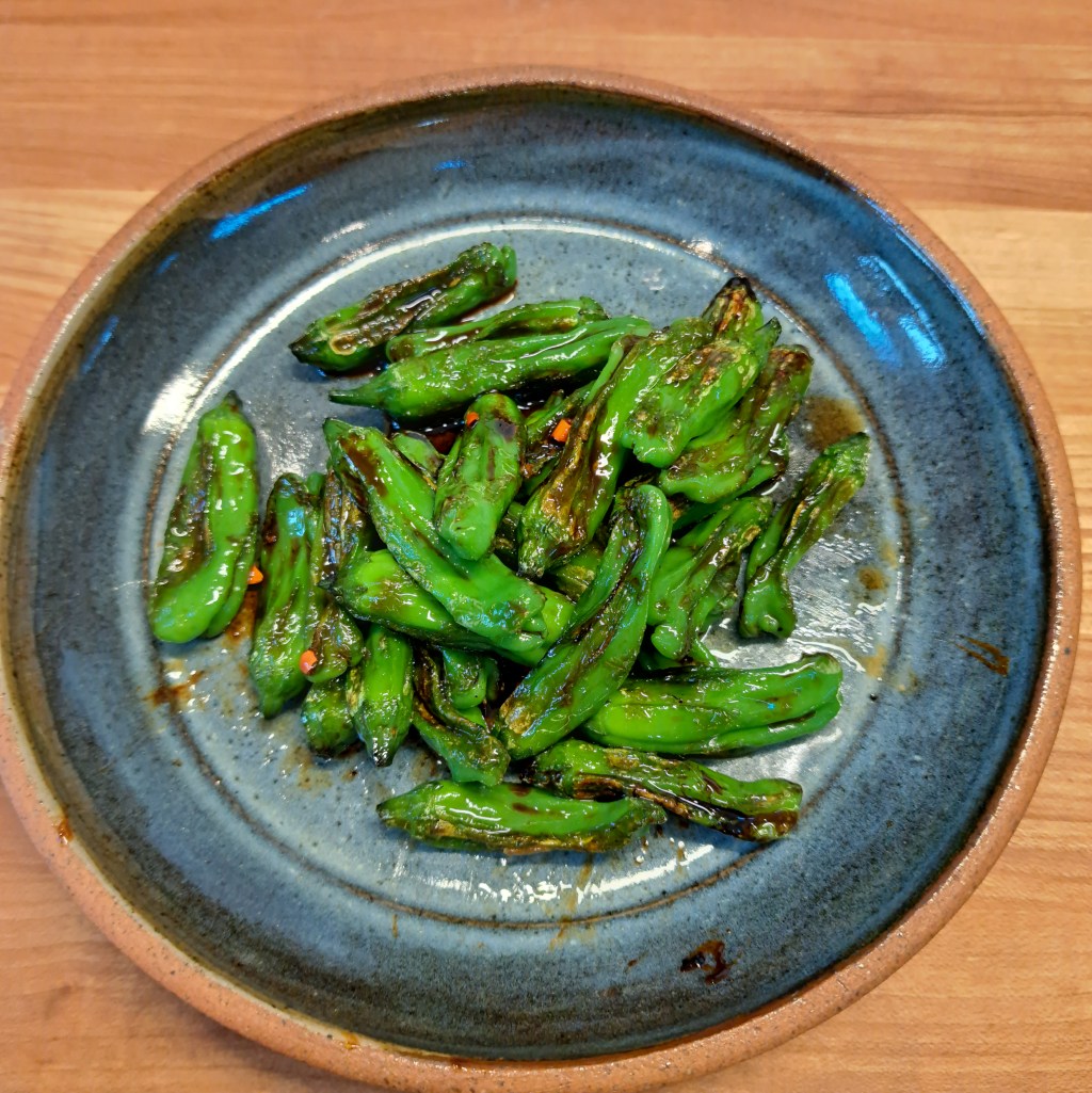 Method: Pan fry shishito peppers until soft with olive oil or butter. Sprinkle with salt. Set aside. Saute garlic and mushrooms in the same pan. Add more oil/butter as required. Sprinkle with salt. When mushrooms are almost done, bring back shishito peppers, saute together, and adjust taste with salt & pepper and/or soy sauce. (The key is to cook shishito first to avoid overcooking mushrooms) Enjoy!