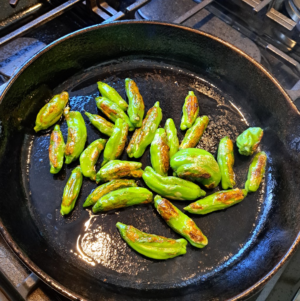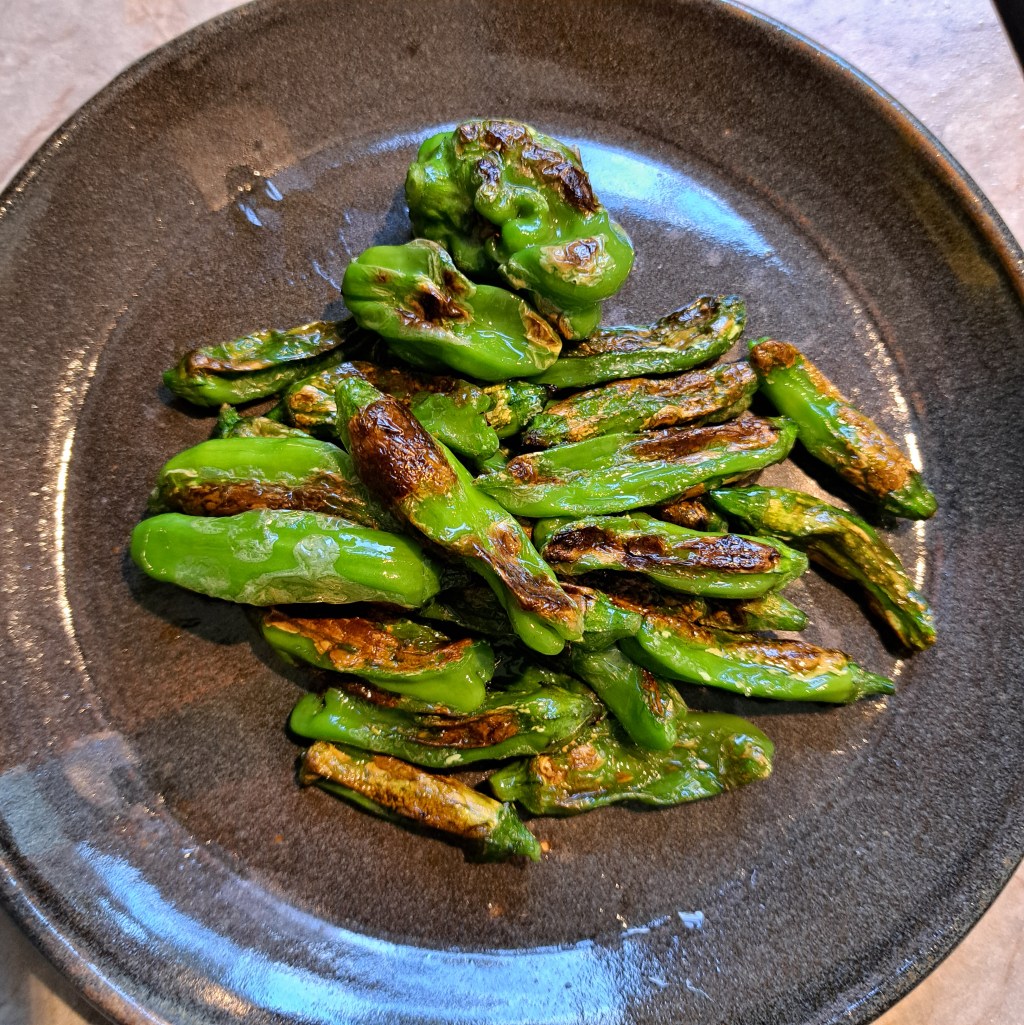 Heat olive oil in the skillet with high heat but do not let it smoke. Add shishito peppers, turn them over occasionally until they blister and become soft. Transfer them to the plate and sprinkle your best quality salt on top. Enjoy!